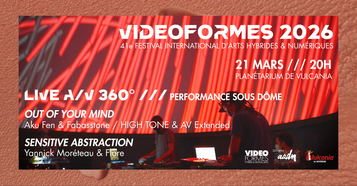 À l’occasion de la 41ᵉ édition du Festival Vidéoformes, festival international des arts hybrides et numériques de Clermont-Ferrand, découvrez deux performances live audiovisuelles immersives à 360° qui explorent la perception, l’abstraction et les états de conscience dans un dispositif spectaculaire sous dôme, présenté dans le plus grand planétarium de France.