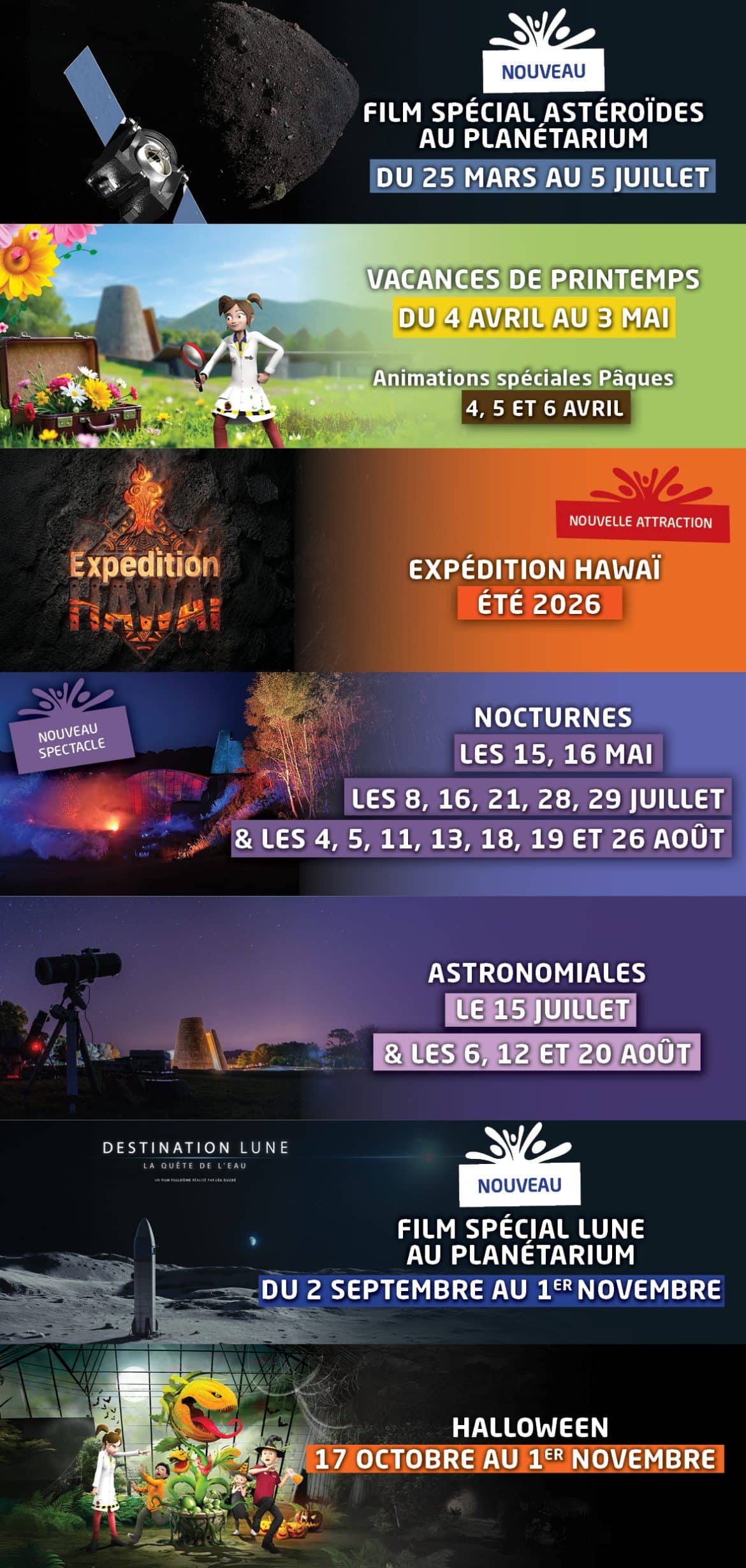 Elles célèbrent les fêtes incontournable comme Pâques et Halloween mais aussi des événements uniques comme le Jour du Soleil. Plongez aussi dans des thématiques captivantes autour de la Lune et des astéroïdes au printemps et à l’automne.